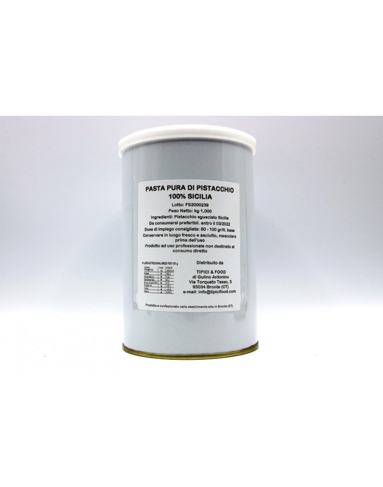 Contiene il 100% di pistacchi, utilizzata soprattutto in gelaterie e pasticcerie per risultati di ottima qualità. Con il contenuto di questa confezione da 1kg si possono ottenere fino a 13lt di gelato al pistacchio dal gusto unico e inconfondibile.